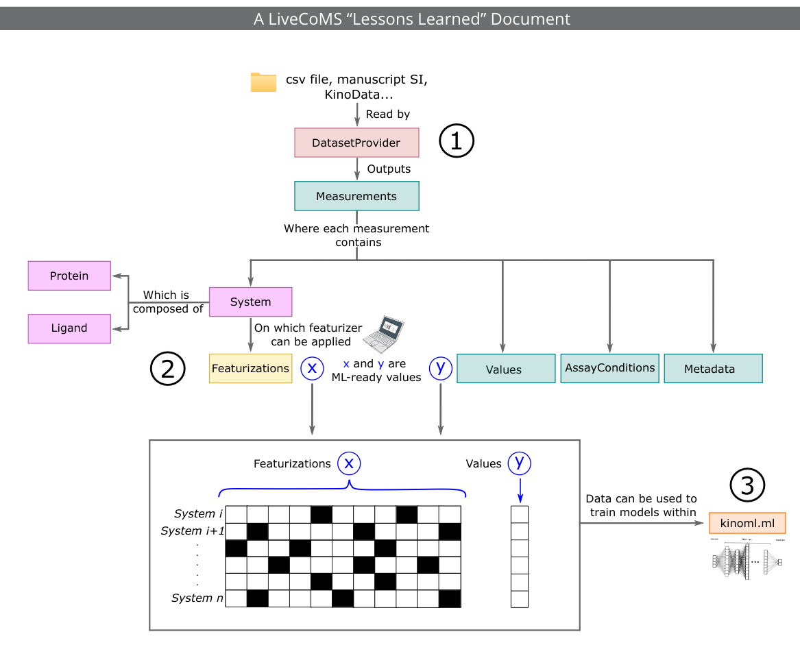 Recent advances in machine learning (ML) are reshaping drug discovery. Structure-based ML methods use physically-inspired models to predict binding affinities from protein:ligand complexes. These methods promise to enable the integration of data for many related targets, which addresses issues related to data scarcity for single targets and could enable generalizable predictions for a broad range of targets, including mutations. In this work, we report our experiences in building KinoML, a novel framework for ML in target-based small molecule drug discovery with an emphasis on structure-enabled methods. KinoML focuses currently on kinases as the relative structural conservation of this protein superfamily, particularly in the kinase domain, means it is possible to leverage data from the entire superfamily to make structure-informed predictions about binding affinities, selectivities, and drug resistance. Some key lessons learned in building KinoML include the importance of reproducible data collection and deposition, the harmonization of molecular data and featurization, and the selection of the right data format to ensure reusability and reproducibility of ML models. As a result, KinoML allows users to easily achieve three tasks: accessing and curating molecular data; featurizing this data with representations suitable for ML applications; and running reproducible ML experiments that require access to ligand, protein, and assay information to predict ligand affinity. Despite KinoML focusing on kinases, this framework can be applied to other proteins. The lessons reported here can help guide the development of platforms for structure-enabled ML in other areas of drug discovery.